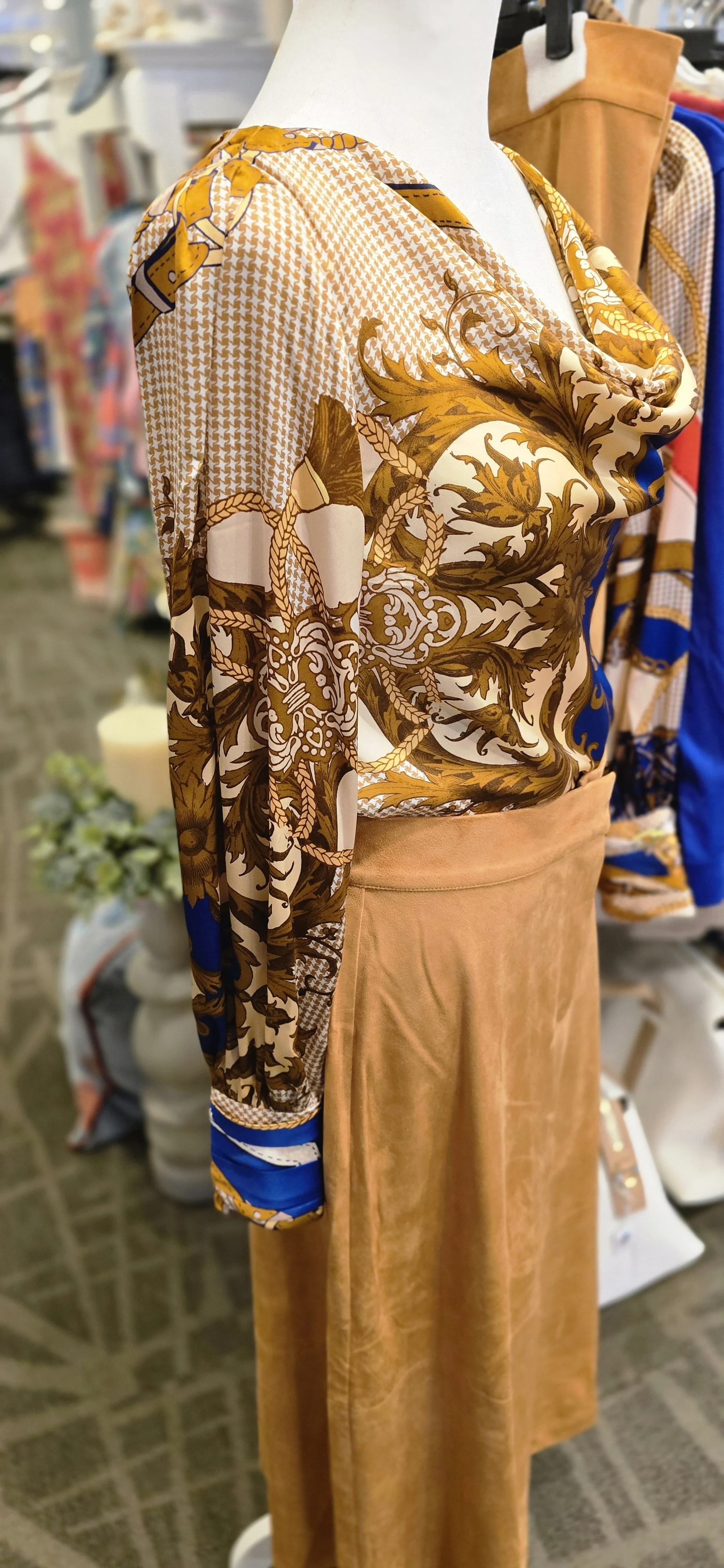 Paired with the Maxine Faux Suede Midi Skirt, the look becomes perfectly grounded. The suede-like texture adds warmth and depth, balancing the fluidity of the silk top. The midi length keeps things chic and versatile—easy to style with boots during cooler months or dressed up with heels for evenings out.